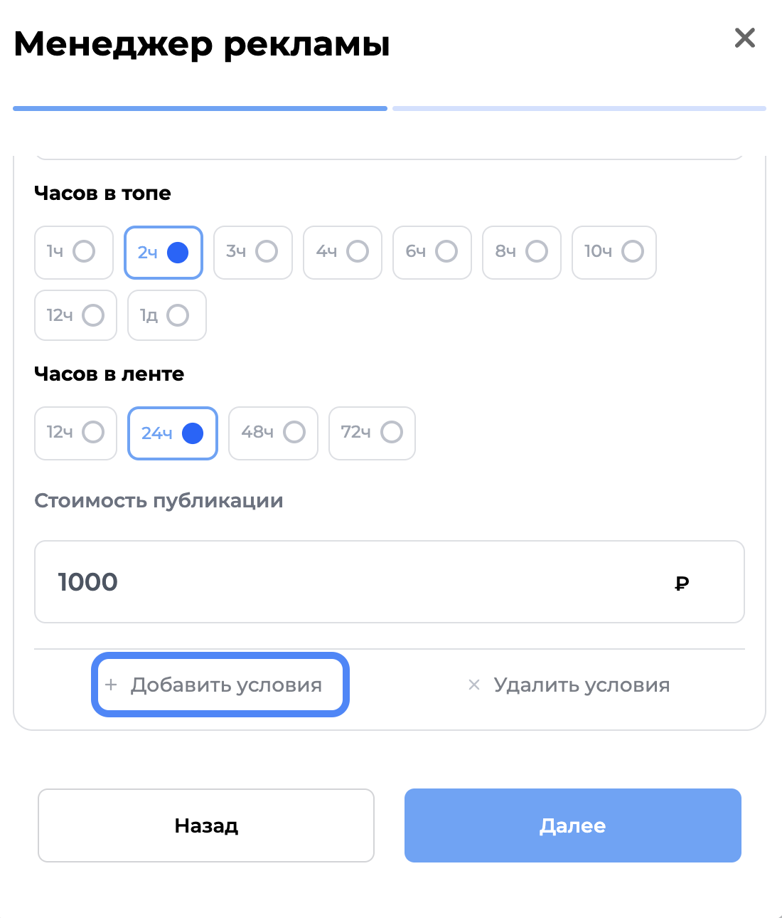 Обращаем ваше внимание, что в одном объявлении вы можете регистрировать сразу несколько условий публикации,