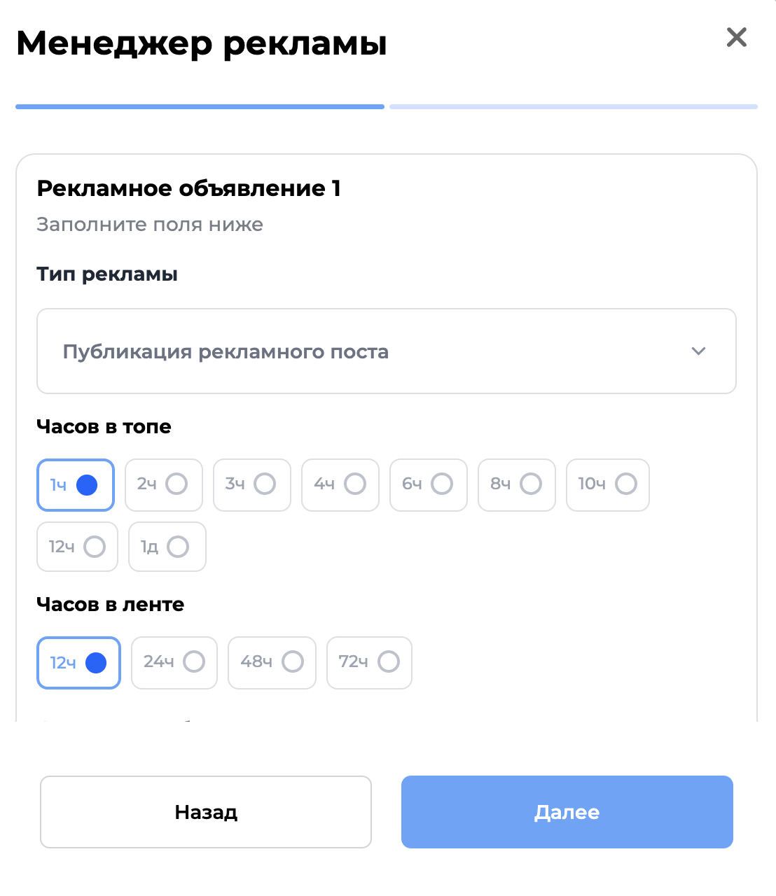 Подробнее о типах рекламы вы можете изучить в нашей статье "Типы рекламы" Как только вы заполните всю необходимую информацию - нажмите "Далее"