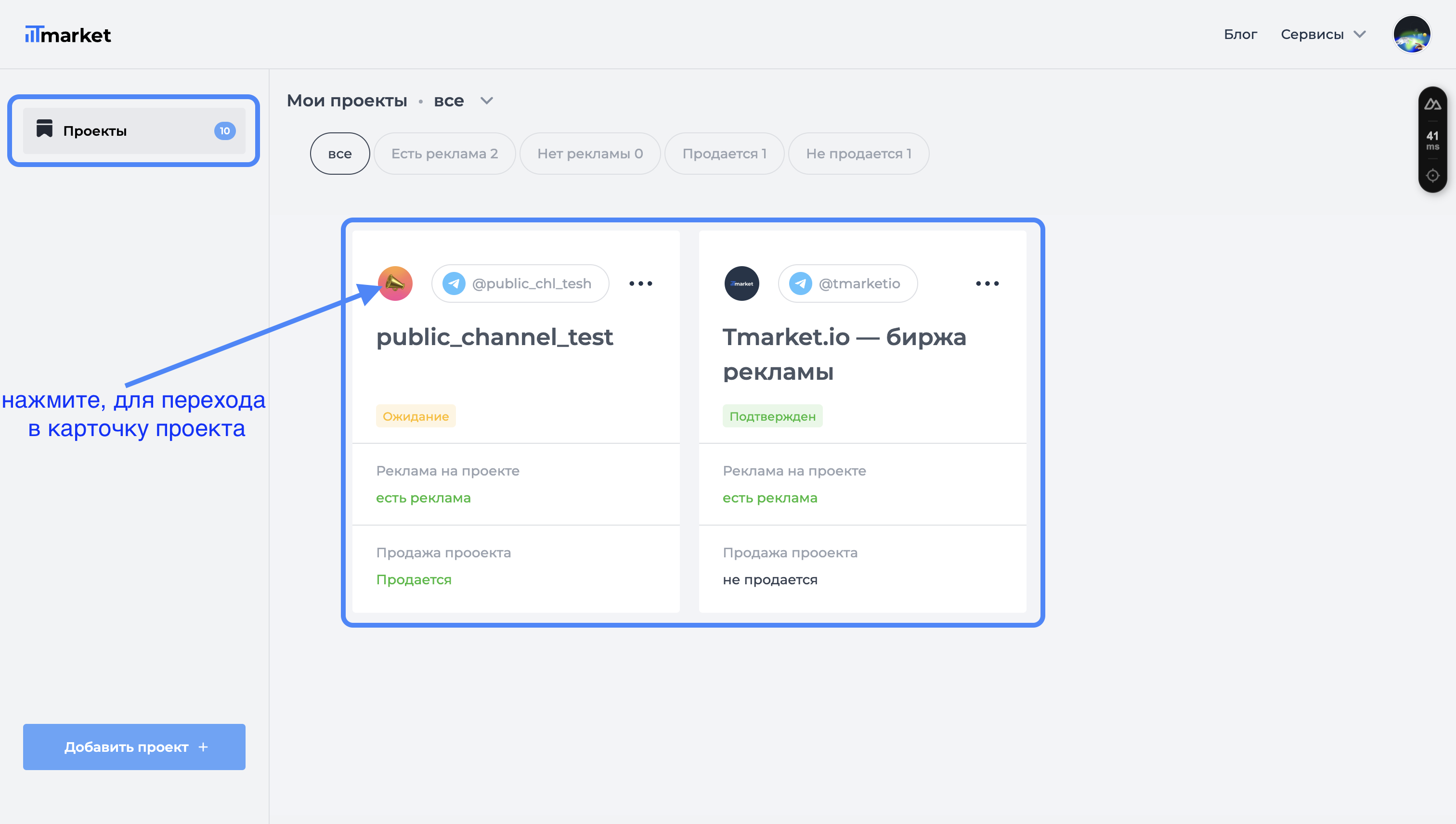 После того, как вы добавили новый п роект, он появится у вас в личном кабинете, в разделе "Мои проекты" Откройте данный раздел, найдите ваш проект и перейдите в его детальную карточку